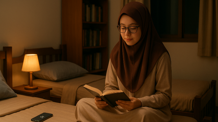 Keempat, praktik membaca ringan seperti buku catatan fikih atau tasawuf dapat menjadi pengantar tidur. Bacaan tanpa target akan menenangkan pikiran dan mengurangi dorongan berpikir berat sebelum tidur.
